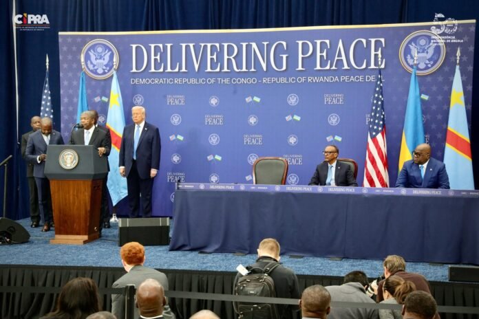 participantes no acto, entre eles Donald Trump, Presidente dos Estados Unidos da América; Paul Kagame, Presidente do Ruanda, e Félix Antoine Tshisekedi Tshilombo, Presidente da República Democrática do Congo.